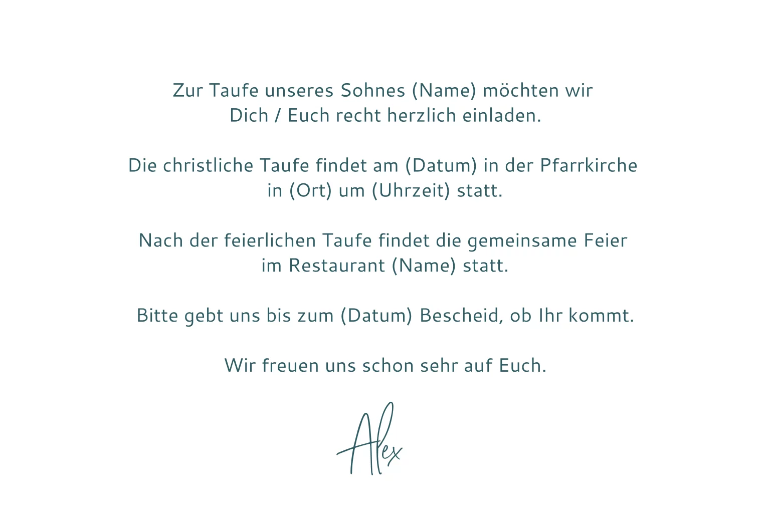 Diese Einladung zur Taufe bietet Platz für drei Ihrer persönlichen Fotos. Rechts oben ist das Datum der Taufe und links unten der Name des Täuflings zu sehen.Melde dich für unseren Newsletter an und profitiere von exklusiven Angeboten, kreativen Ideen und Neuigkeiten aus unserer Produktwelt. Als Dankeschön für deine Anmeldung schenken wir dir einen kostenlosen Probedruck deiner Karte.