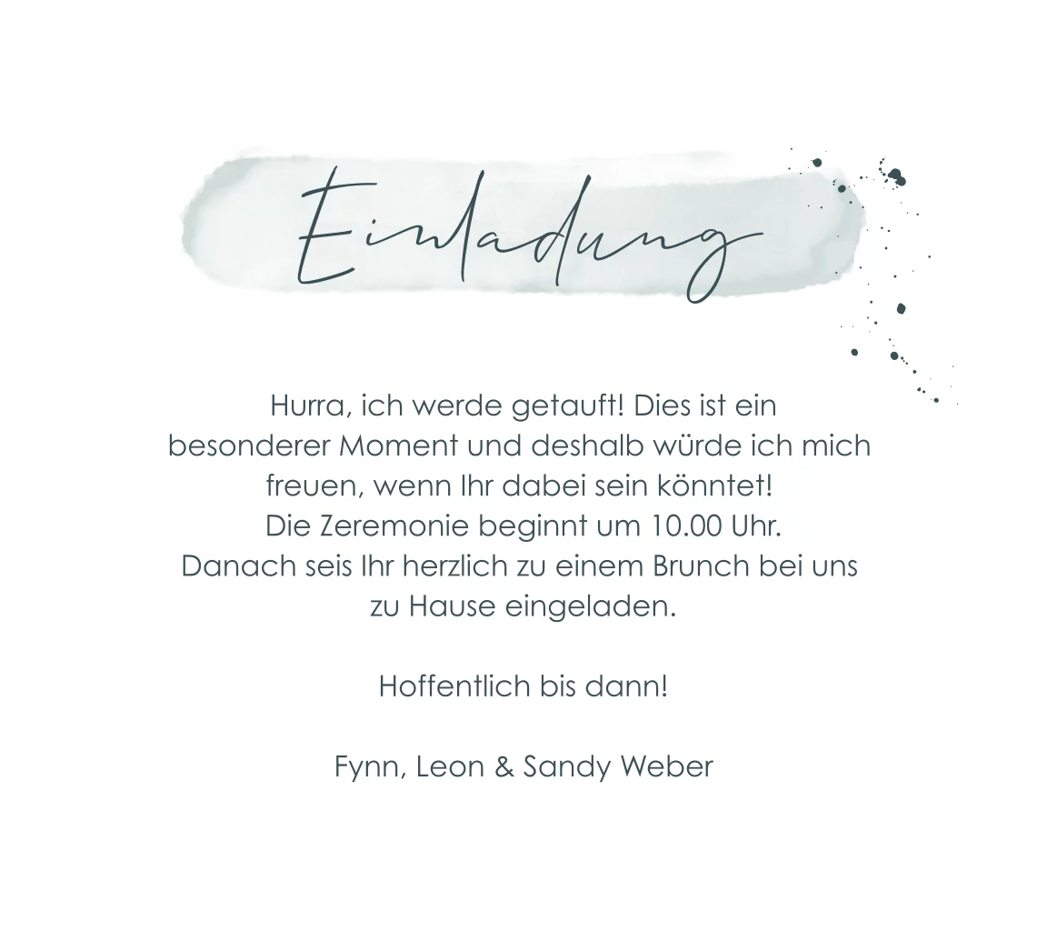 Hübsche Einladung zur Taufe mit zarten Aquarell-Grüntönen und HerzchenMelde dich für unseren Newsletter an und profitiere von exklusiven Angeboten, kreativen Ideen und Neuigkeiten aus unserer Produktwelt. Als Dankeschön für deine Anmeldung schenken wir dir einen kostenlosen Probedruck deiner Karte.
