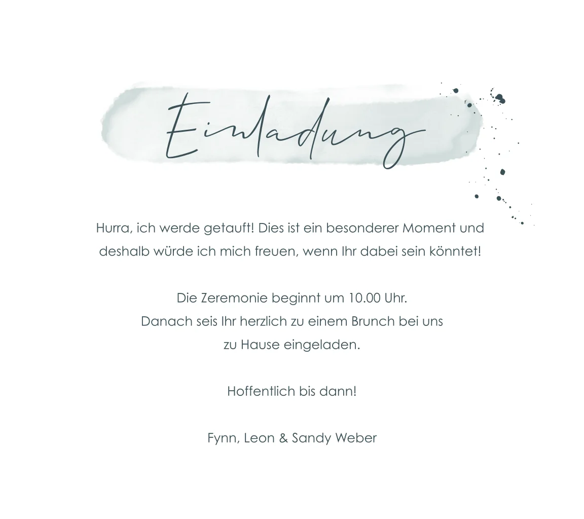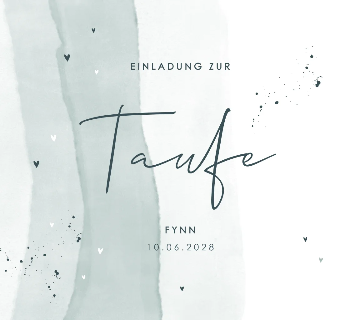 Hübsche Einladung zur Taufe mit zarten Aquarell-Grüntönen und HerzchenDas Design der von dir gewählten Karte wurde automatisch in andere Formate umgestellt. Wähle einfach deinen Wunschformat aus und platziere alle Texte und Elemente an der richtigen Stelle im Editor. Du hast Fragen oder dein Favorit steht nicht zur Auswahl? Dann kontaktiere uns bitte und wir werden uns gemeinsam darum kümmern!