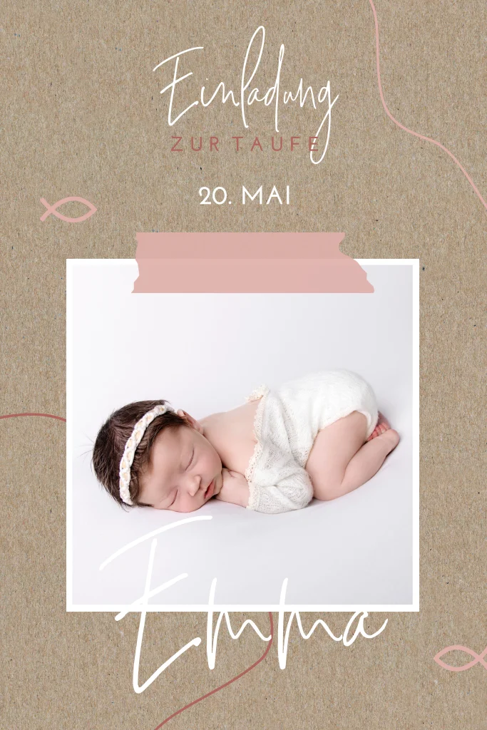 Süße Einladung zur Taufe mit Foto auf Kraft-Look mit rosa Schrift