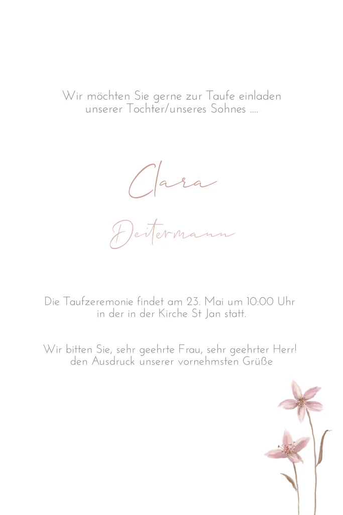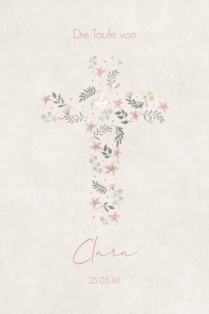 Eine schöne Einladungskarte für die Taufe Ihres Babys mit einem Kreuz, das aus kleinen Blumen und einer niedlichen Taube besteht. Sie können den Text und die Schriftart dieser Taufkarte selbst bearbeiten.
