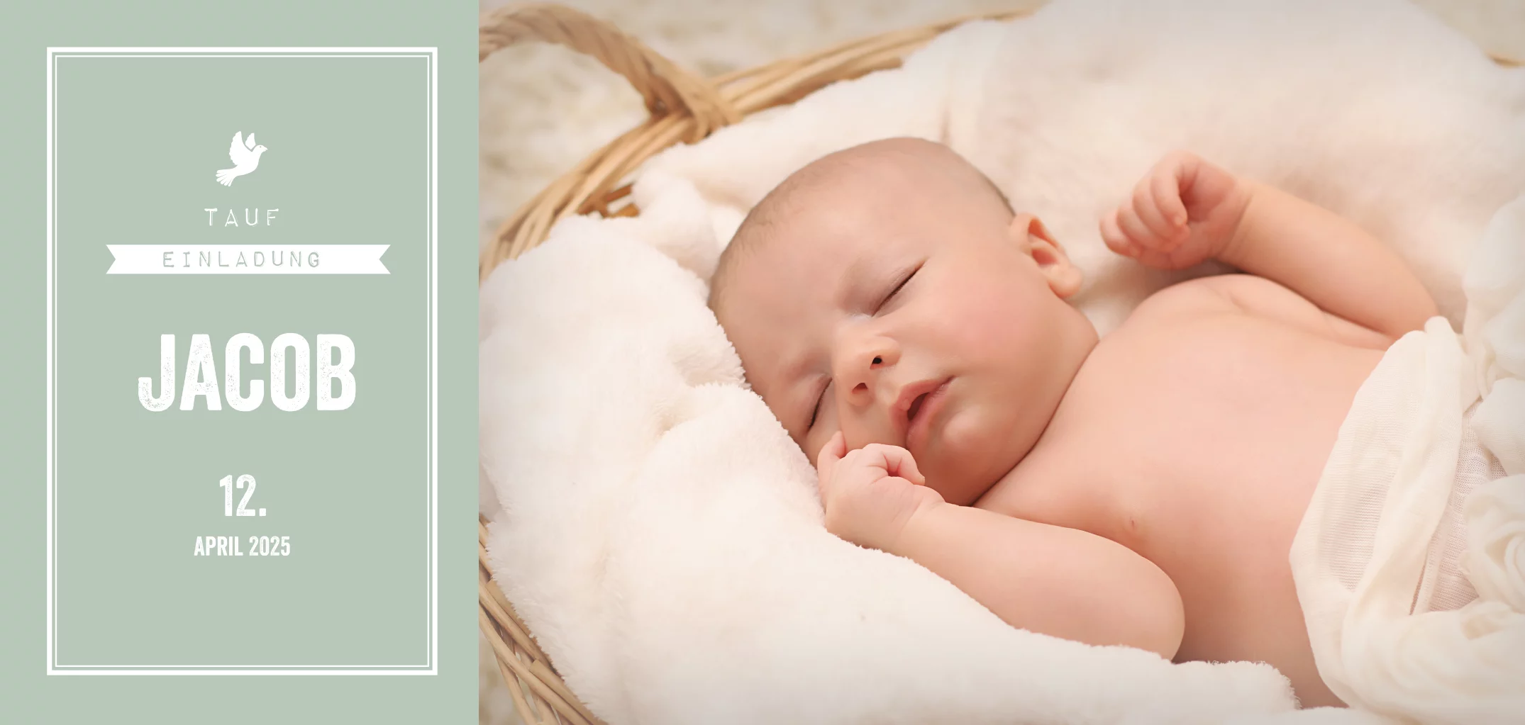 Schöne Taufeinladung mit großem Babyfoto und Taubenillustration
