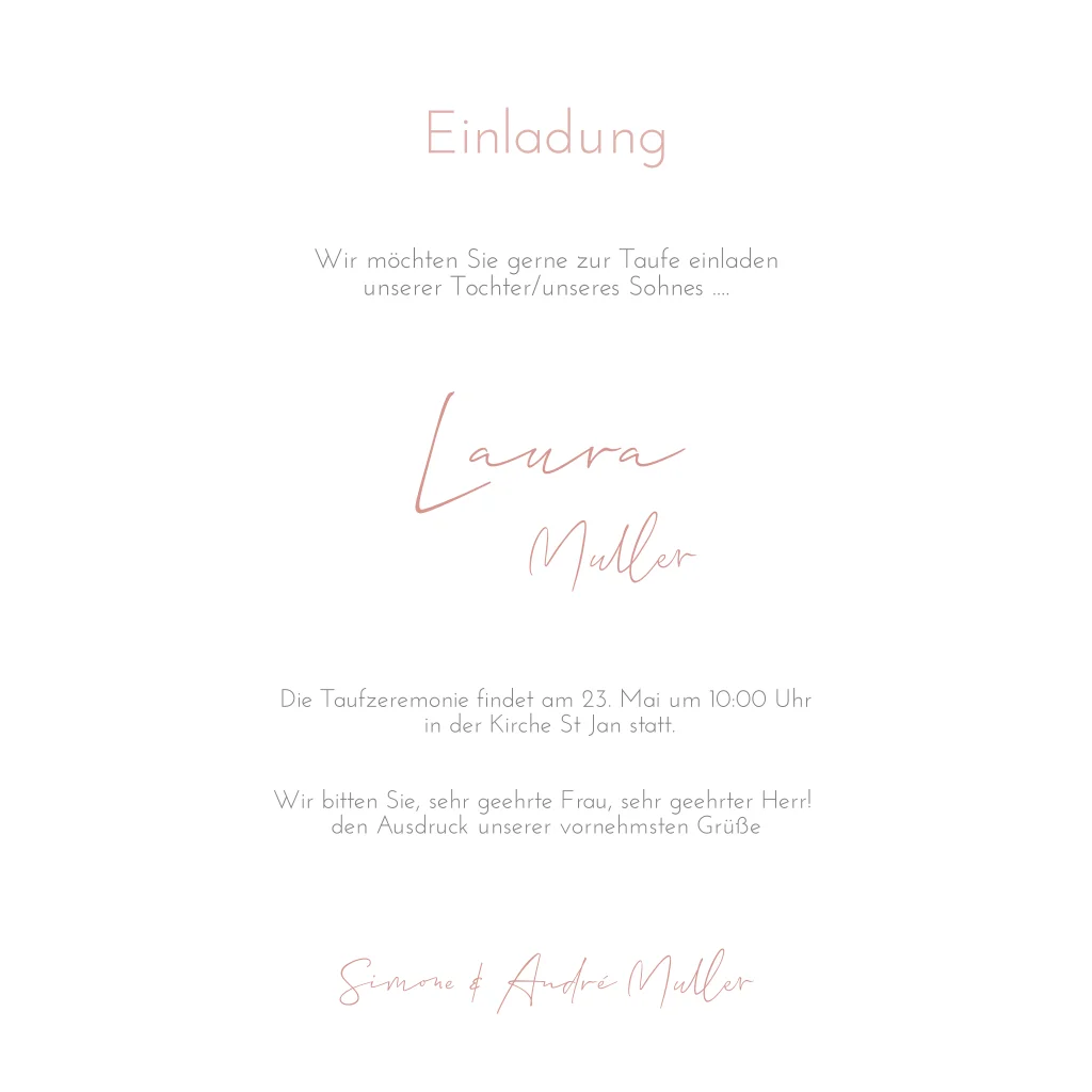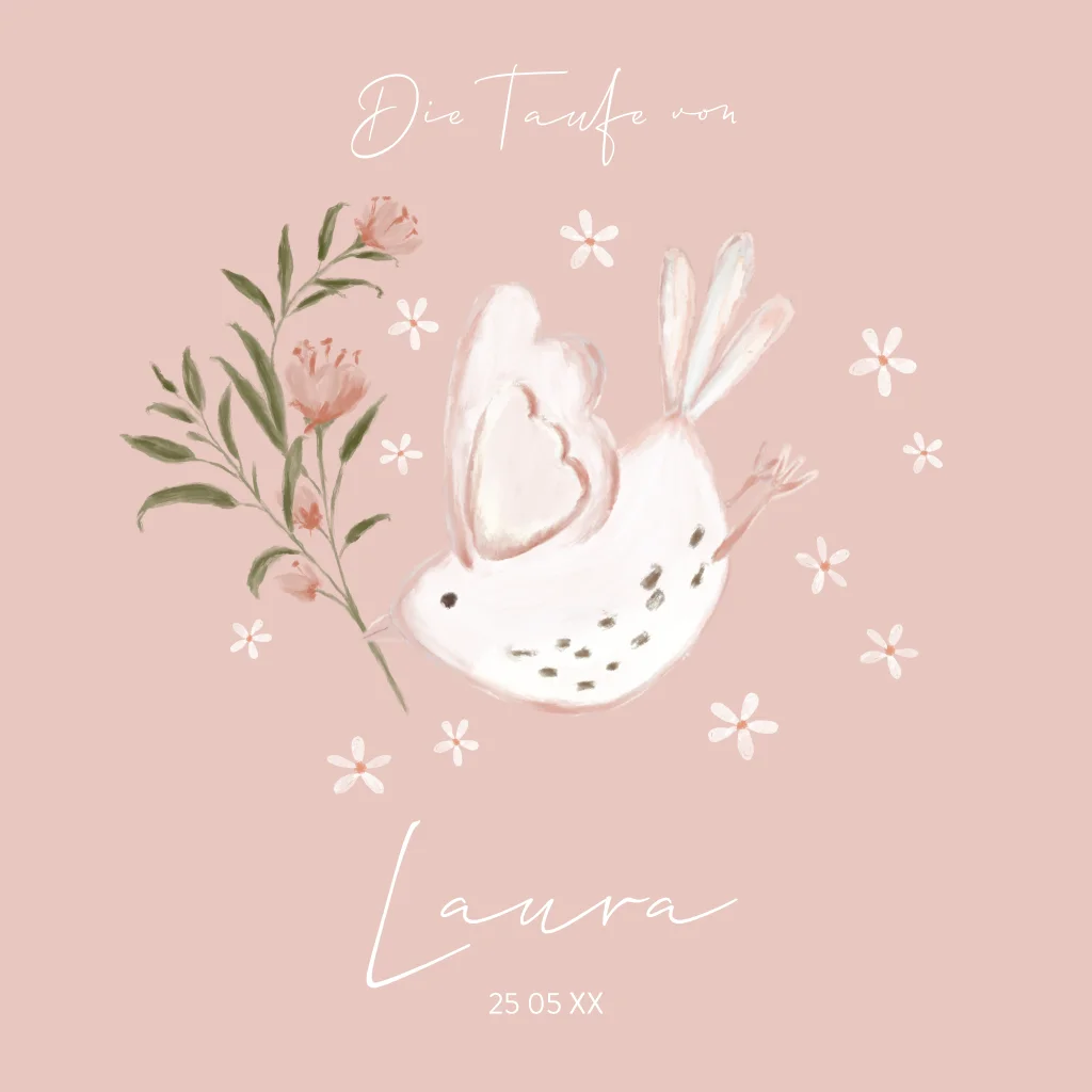 Eine hübsche Taufkarte mit einer illustrierten Taube und einem Blumen­zweig, die du nach deinen Wünschen gestalten kannst.