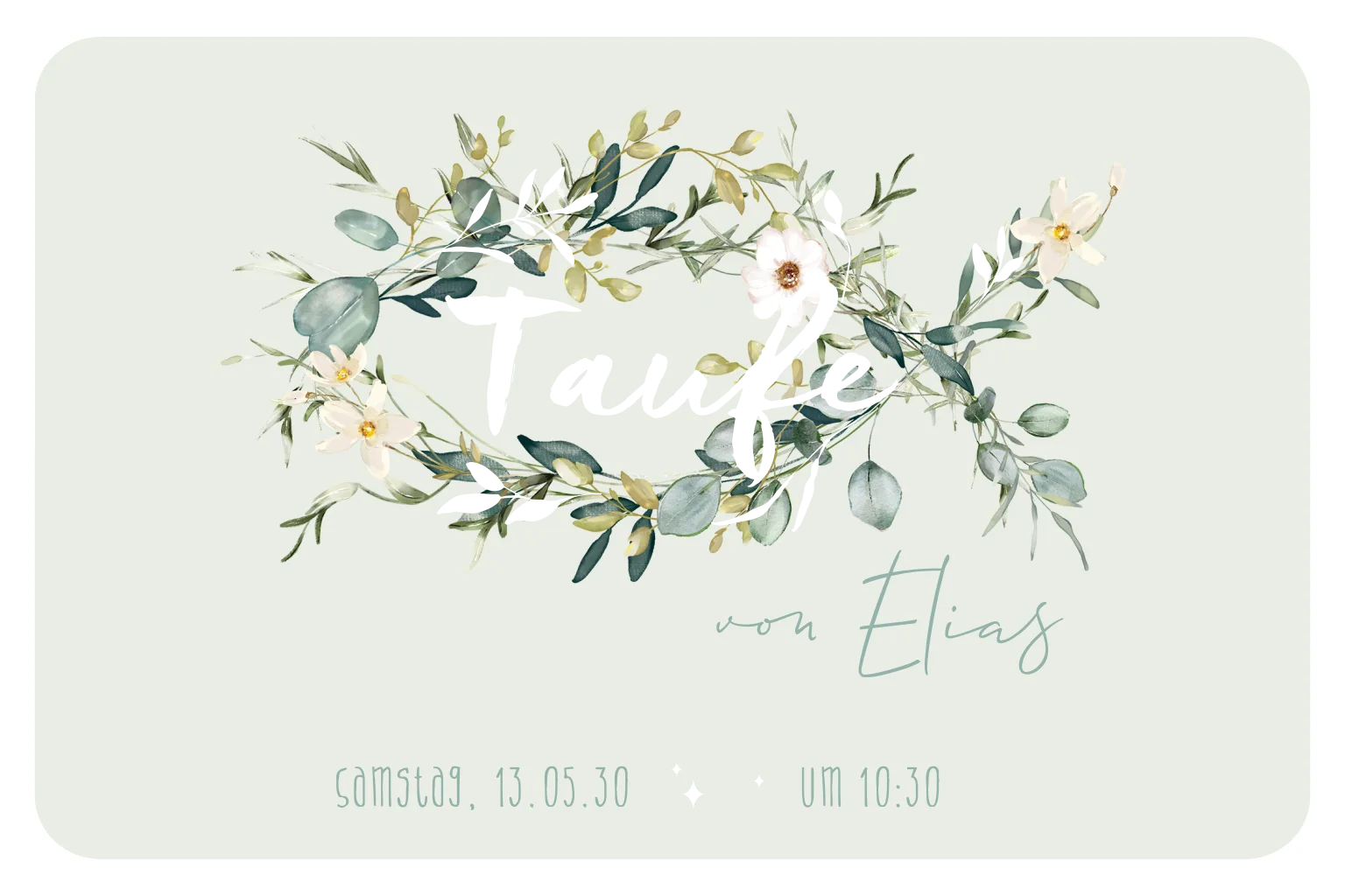 Hübsche Einladung mit verspieltem Ichthys aus Blättern und Zweigen. Auf der Vorderseite ist das Wort 'Kommunion' in Foliendruk abgebildet. Dies kannst du natürlich je nach Belieben ändern.Das Design der von dir gewählten Karte wurde automatisch in andere Formate umgestellt. Wähle einfach deinen Wunschformat aus und platziere alle Texte und Elemente an der richtigen Stelle im Editor. Du hast Fragen oder dein Favorit steht nicht zur Auswahl? Dann kontaktiere uns bitte und wir werden uns gemeinsam darum kümmern!