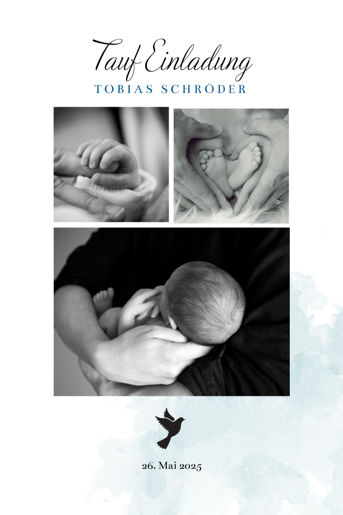 Taufeinladung für Jungen mit Fotos und blauem Wasserfarben-Look