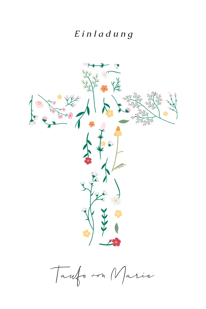 Taufkarte mit Blumen in Form eines Kreuzes