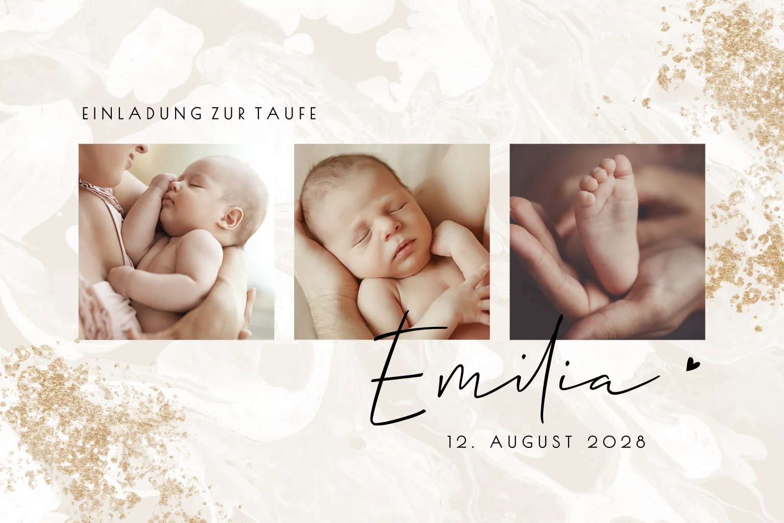 Verspielte Einladung zur Taufe mit Fotos und GoldspritzernMelde dich für unseren Newsletter an und profitiere von exklusiven Angeboten, kreativen Ideen und Neuigkeiten aus unserer Produktwelt. Als Dankeschön für deine Anmeldung schenken wir dir einen kostenlosen Probedruck deiner Karte.