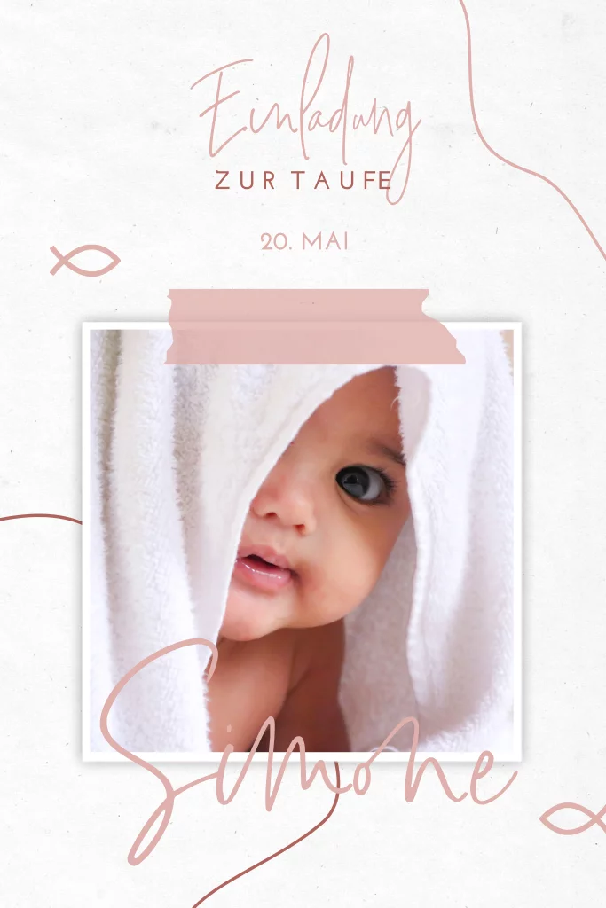 Diese wunderschöne Einladung zur Taufe hat ein zentrales Bild des Täuflings und rosa Aufschriften in Schreibschrift. Im Hintergrund sind Fische zu sehen.