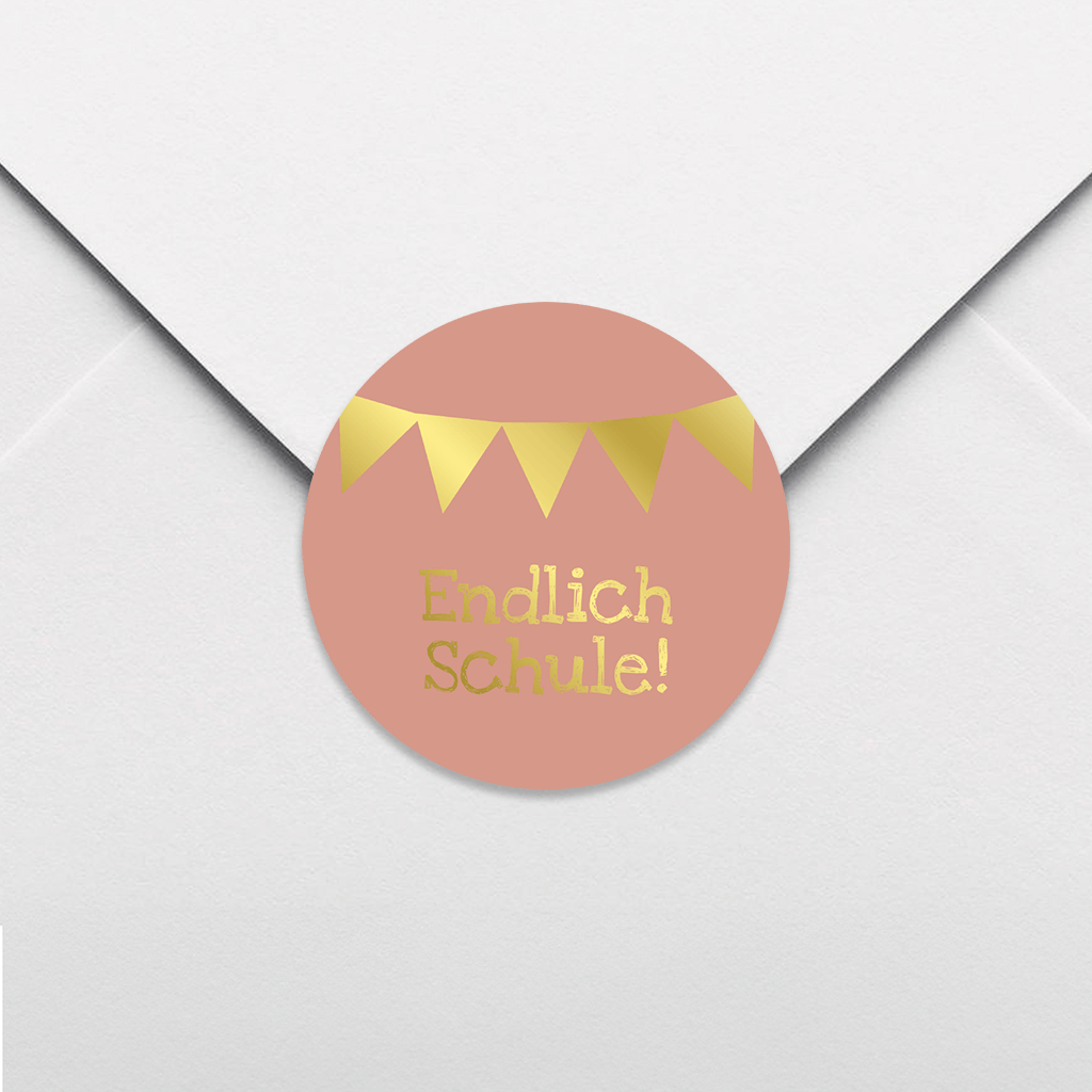 Aufkleber Einschulung mit Goldfolie, Girlande und rosa Hintergrund