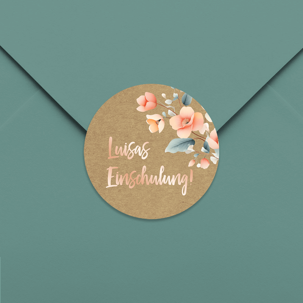 Aufkleber Einschulung mit Rosegoldfolie und Blumen.
