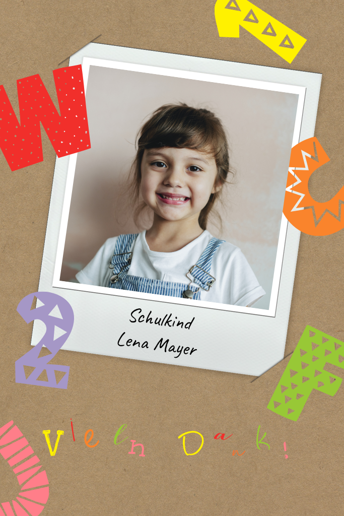 Dankeskarte zur Einschulung bunter Buchstabensalat Polaroid Kraft-Look