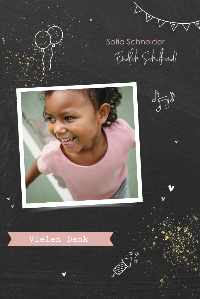 Tolle Danksagung zur Einschulung deines Schulkindes. Auf der Vorder- und Rückseite hast du Platz für Fotos.Das Design der von dir gewählten Karte wurde automatisch in andere Formate umgestellt. Wähle einfach deinen Wunschformat aus und platziere alle Texte und Elemente an der richtigen Stelle im Editor. Du hast Fragen oder dein Favorit steht nicht zur Auswahl? Dann kontaktiere uns bitte und wir werden uns gemeinsam darum kümmern!