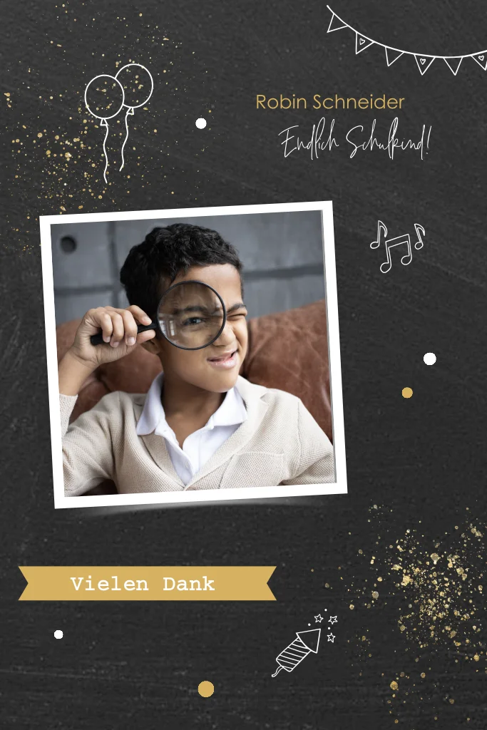 Tolle Danksagung zur Einschulung deines Schulkindes. Auf der Vorder- und Rückseite hast du Platz für Fotos.Das Design der von dir gewählten Karte wurde automatisch in andere Formate umgestellt. Wähle einfach deinen Wunschformat aus und platziere alle Texte und Elemente an der richtigen Stelle im Editor. Du hast Fragen oder dein Favorit steht nicht zur Auswahl? Dann kontaktiere uns bitte und wir werden uns gemeinsam darum kümmern!