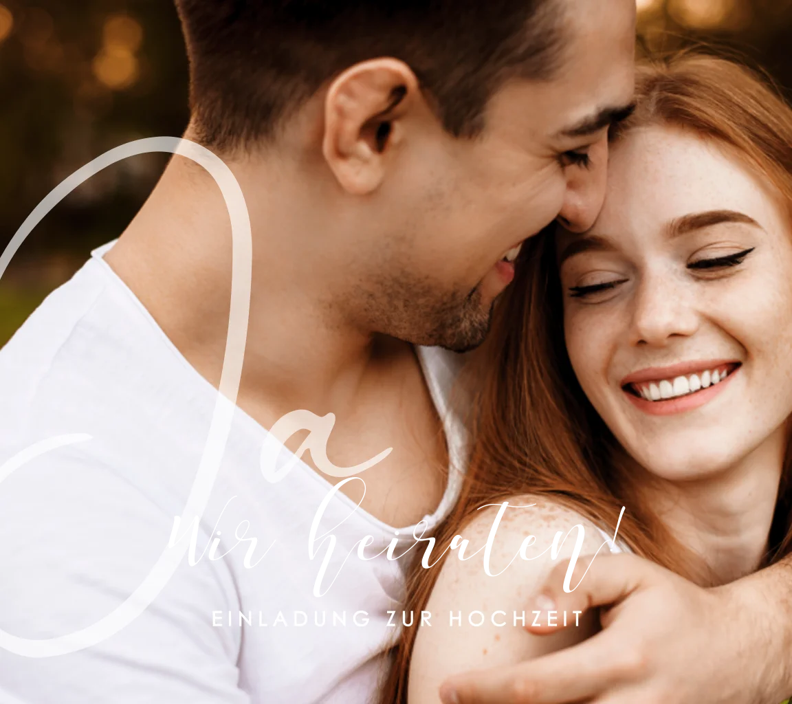 Quadratische Hochzeitseinladung mit Foto und stilvollen Schriftzügen in Roségoldfolie.Bei quadratische Karten fällt ggf. ein anderes Briefporto an. Alle Infos findest du auf der Website der Deutschen Post. Zu diesem Format erhältst du Umschläge in der Größe 14x12,5 cm. Format ändern ist möglich.