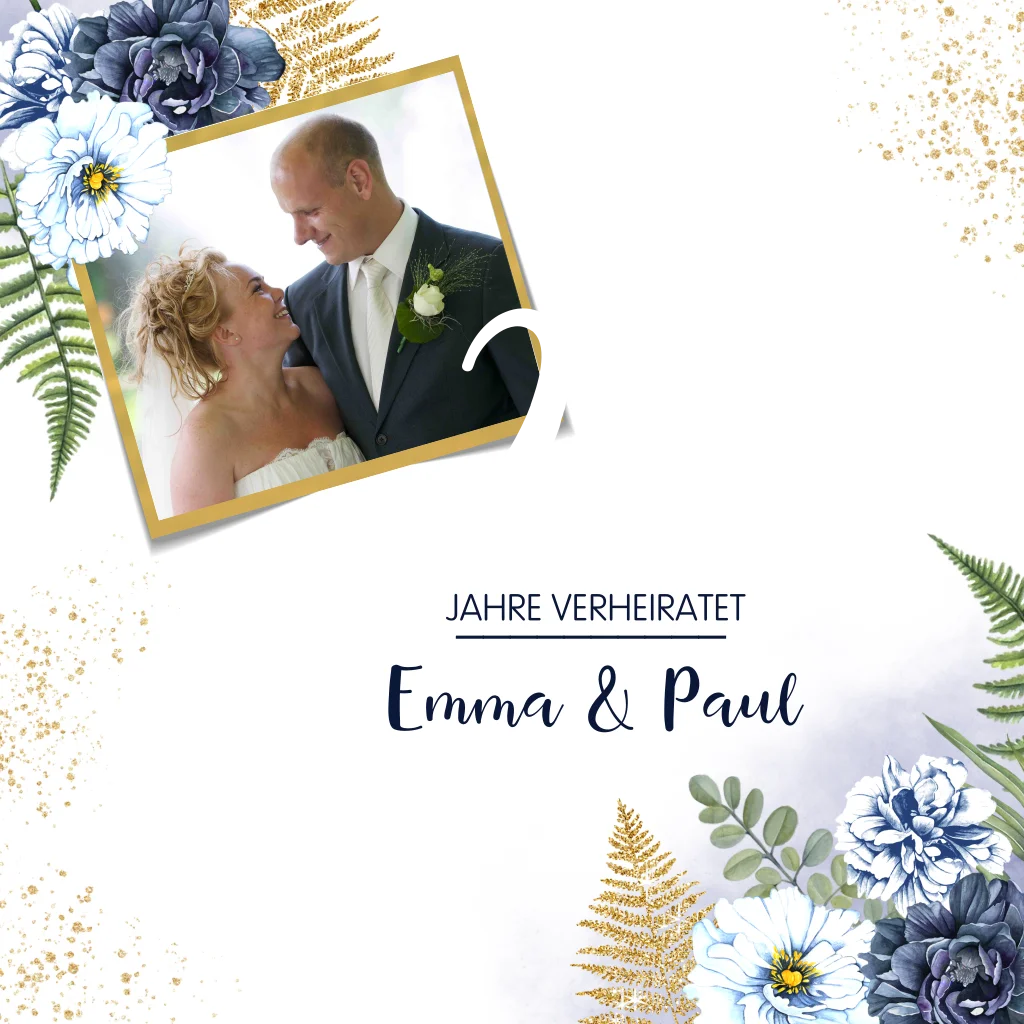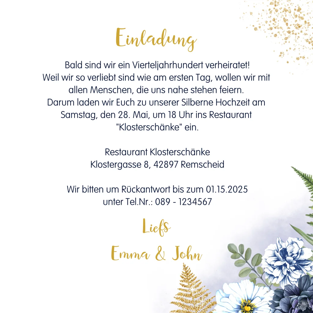 Stilvolle Einladung zur Silberhochzeit auf Goldfolie mit blauen Blumen in Wasserfarben, Zweigen und Foto.