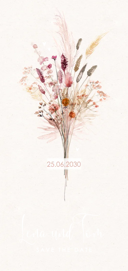 Stilvolle längliche Safe the Date Karte mit schönem Feldblumenstrauß und Schriftzügen im Roségoldfoliedruck.