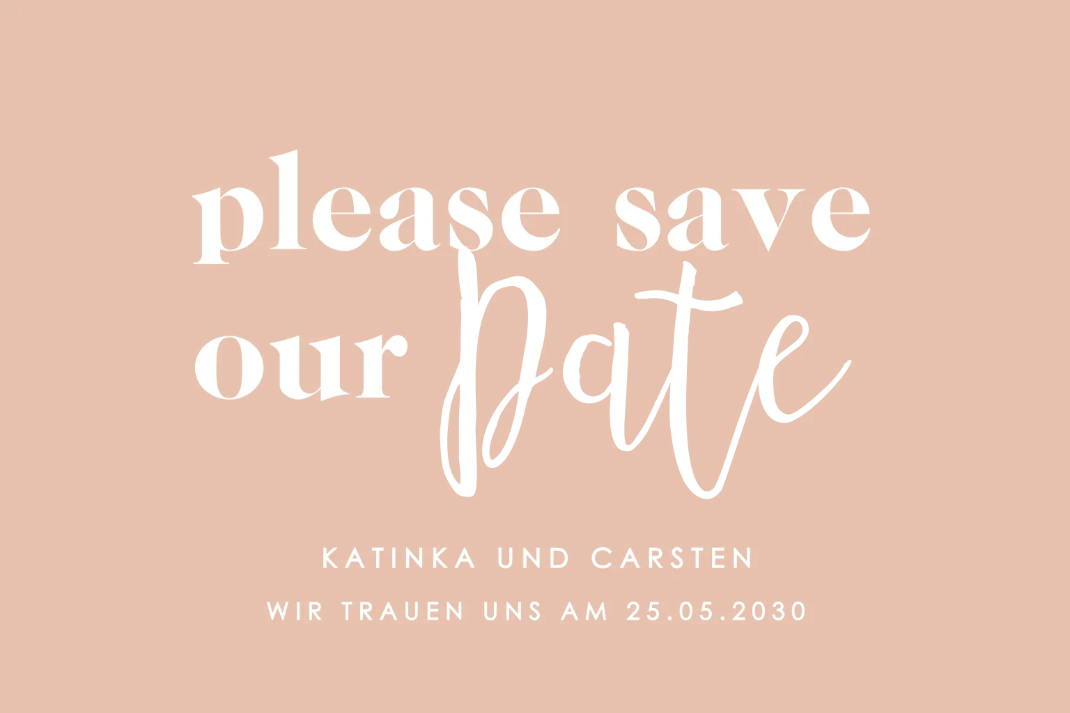 Rechteckige doppelseitige Save the Date Karte in zartem Apricot-Ton. Stilvoll durch ihr schlichtes Design und den Roségoldfoliedruck auf der Vorderseite.