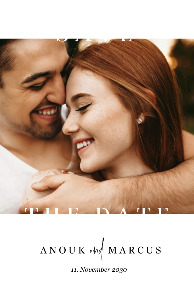 Stilvolle Save-the-Date Karte mit Eurem Foto auf der Vorderseite und der wichtigsten Botschaft in schimmernder Goldfolie.