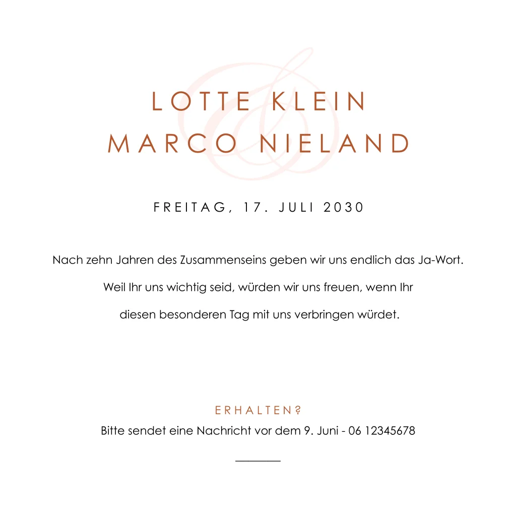 Eine tolle Einladung zur Hochzeit im Vintage-Look mit Roségoldfoliedruck. Mit diesen zeitlosen blumigen Motiven liegt ihr absolut im Trend.Bei quadratische Karten fällt ggf. ein anderes Briefporto an. Alle Infos findest du auf der Website der Deutschen Post. Zu diesem Format erhältst du Umschläge in der Größe 14x12,5 cm. Format ändern ist möglich.