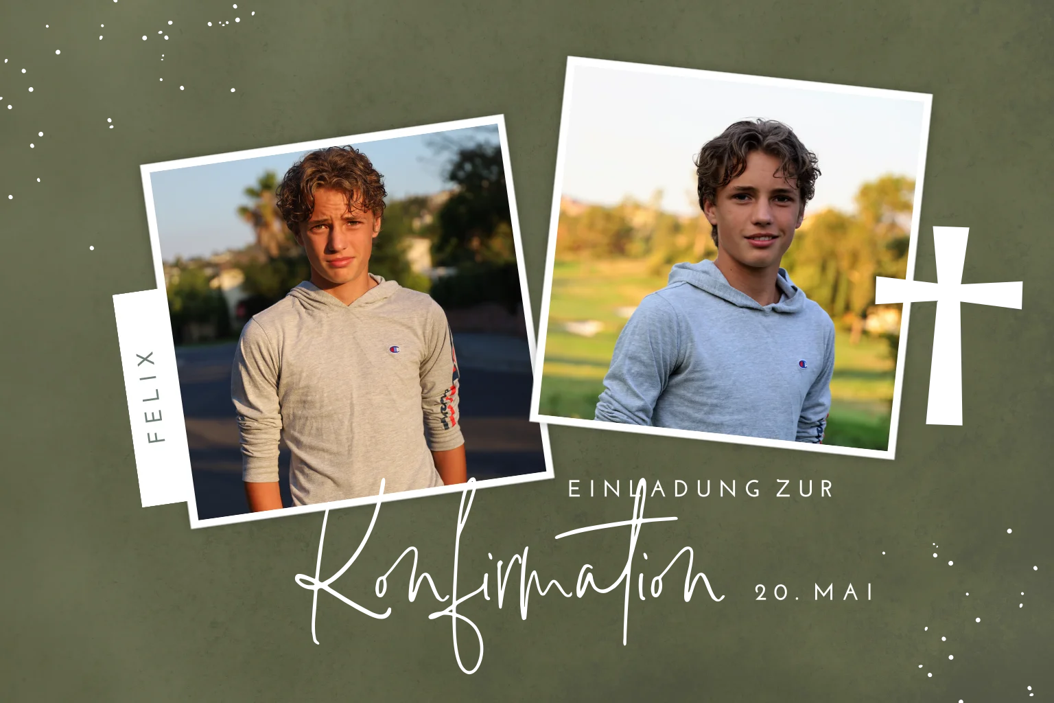 Einladungskarte zur Konfirmation mit Platz für zwei eigene Fotos, auf einem dunkelgrünen Hintergrund. Der Text und das Kreuz sind in Goldfolie veredelt.