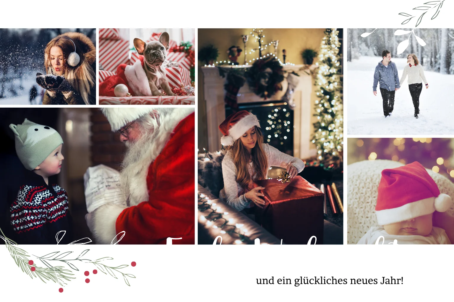 Auf dieser Weihnachtskarte ist weihnachtlich viel Platz für Ihre eigenen Fotos. Der Schriftzug 'Frohe Weihnachen' und die Mistelzweige runden das Bild ab.
