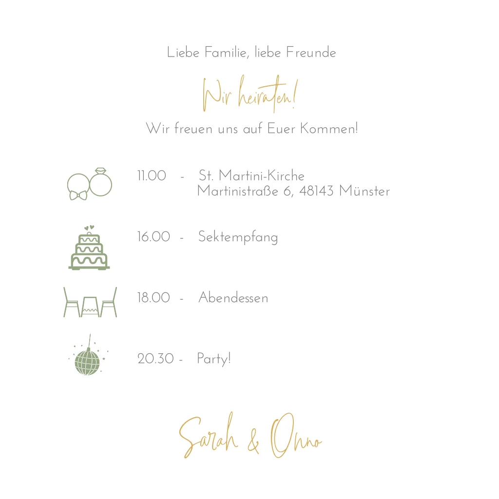 Stilvolle botanische Hochzeitseinladung mit Goldfolie, gemalten Pflanzen, Blättern und Blumen in den Grüntönen.Bei quadratische Karten fällt ggf. ein anderes Briefporto an. Alle Infos findest du auf der Website der Deutschen Post. Zu diesem Format erhältst du Umschläge in der Größe 14x12,5 cm. Format ändern ist möglich.