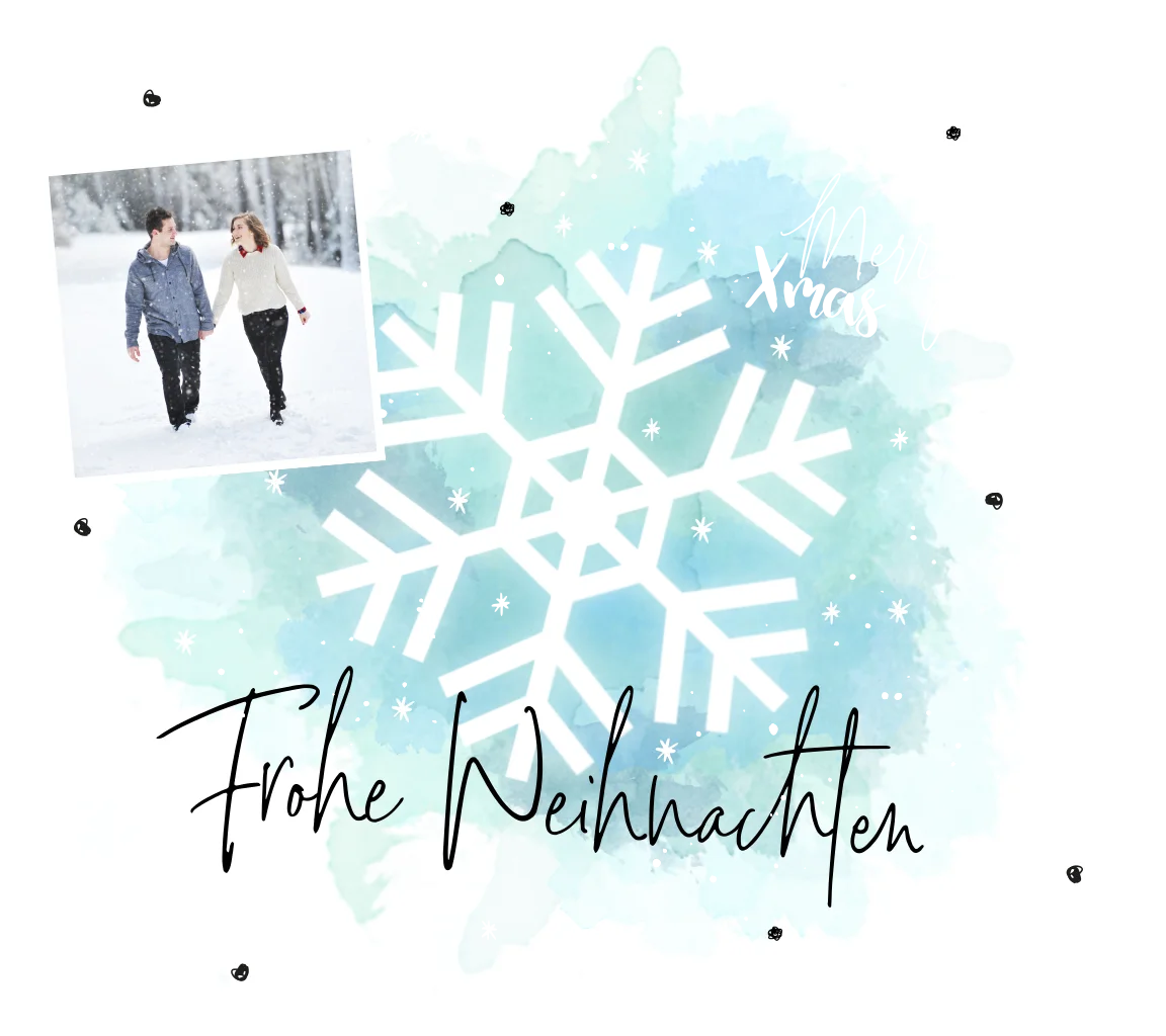 Malerische Weihnachtsbotschaft mit Ihrem persönlichen Motiv auf der Vorderseite. Die Kombination blauer Aquarellfarben mit veredelter Schrift in Silber verleihen Ihrer Karte eine außergewöhnliche Ausstrahlung.Melde dich für unseren Newsletter an und profitiere von exklusiven Angeboten, kreativen Ideen und Neuigkeiten aus unserer Produktwelt. Als Dankeschön für deine Anmeldung schenken wir dir einen kostenlosen Probedruck deiner Karte.
