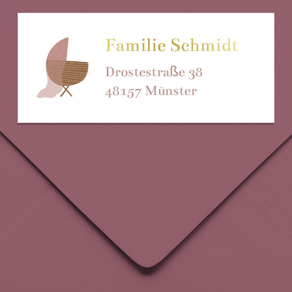 Absenderaufkleber mit rosa Wiege und Goldfolie 70x30mm 14 Stück