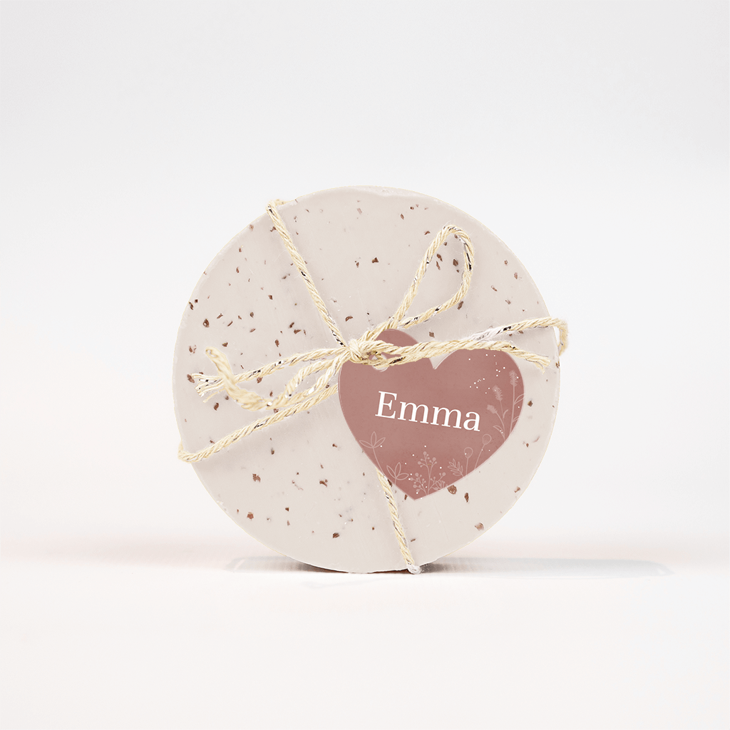 Herzförmiger rosa Anhänger zur Geburt mit schlichten weißen Blumen.