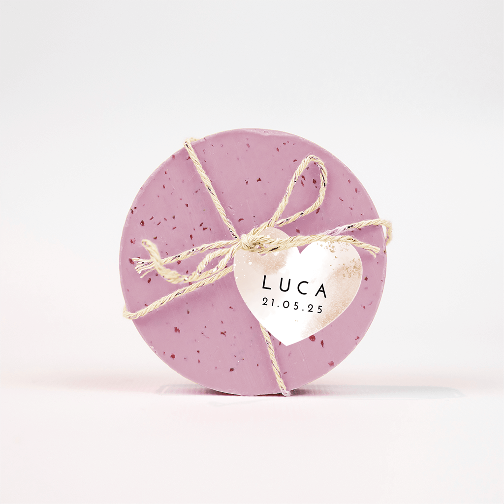 Geschenkanhänger Herz mit rosa Flecken und Herzchen 45x35mm 16 Stück