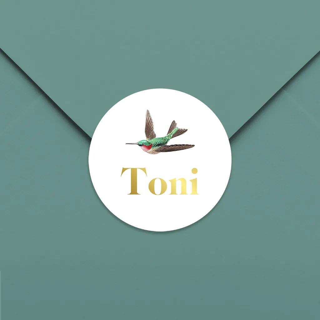 Hübscher einfacher Aufkleber mit Namen in Goldfolie und einem bunten Kolibri.