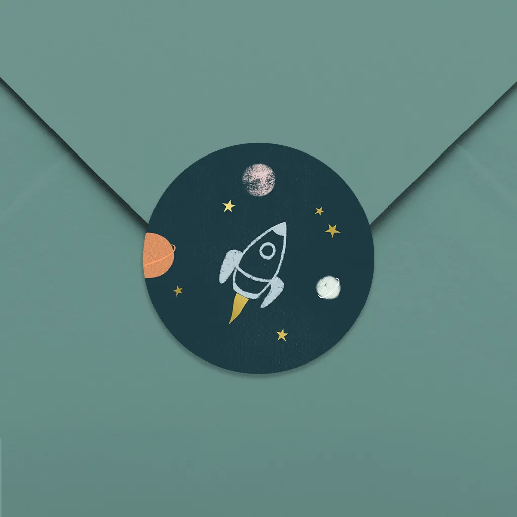 Aufkleber mit Rakete, Mond, Planeten und Sternen