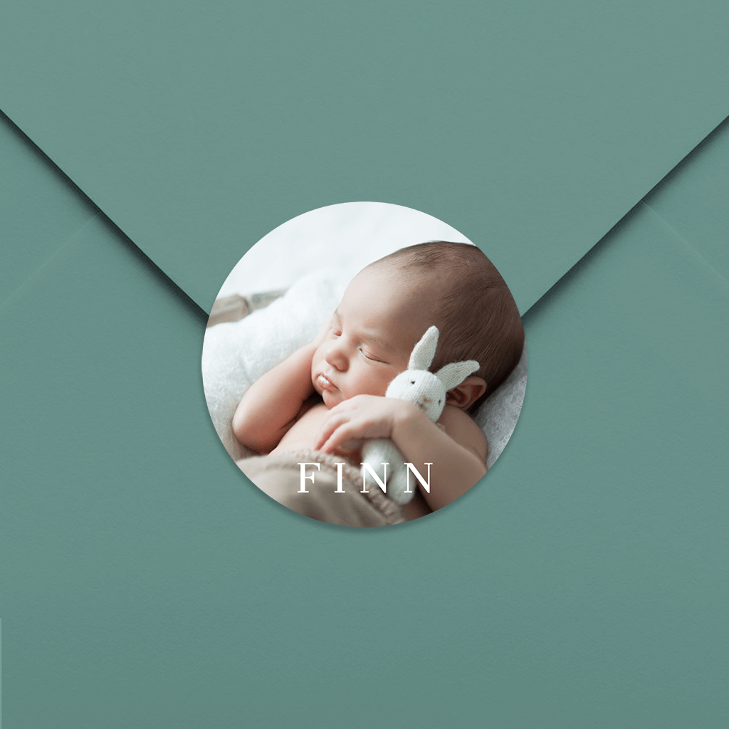 Niedlicher Aufkleber zur Geburts - Dankeskarte mit Bild und Namen