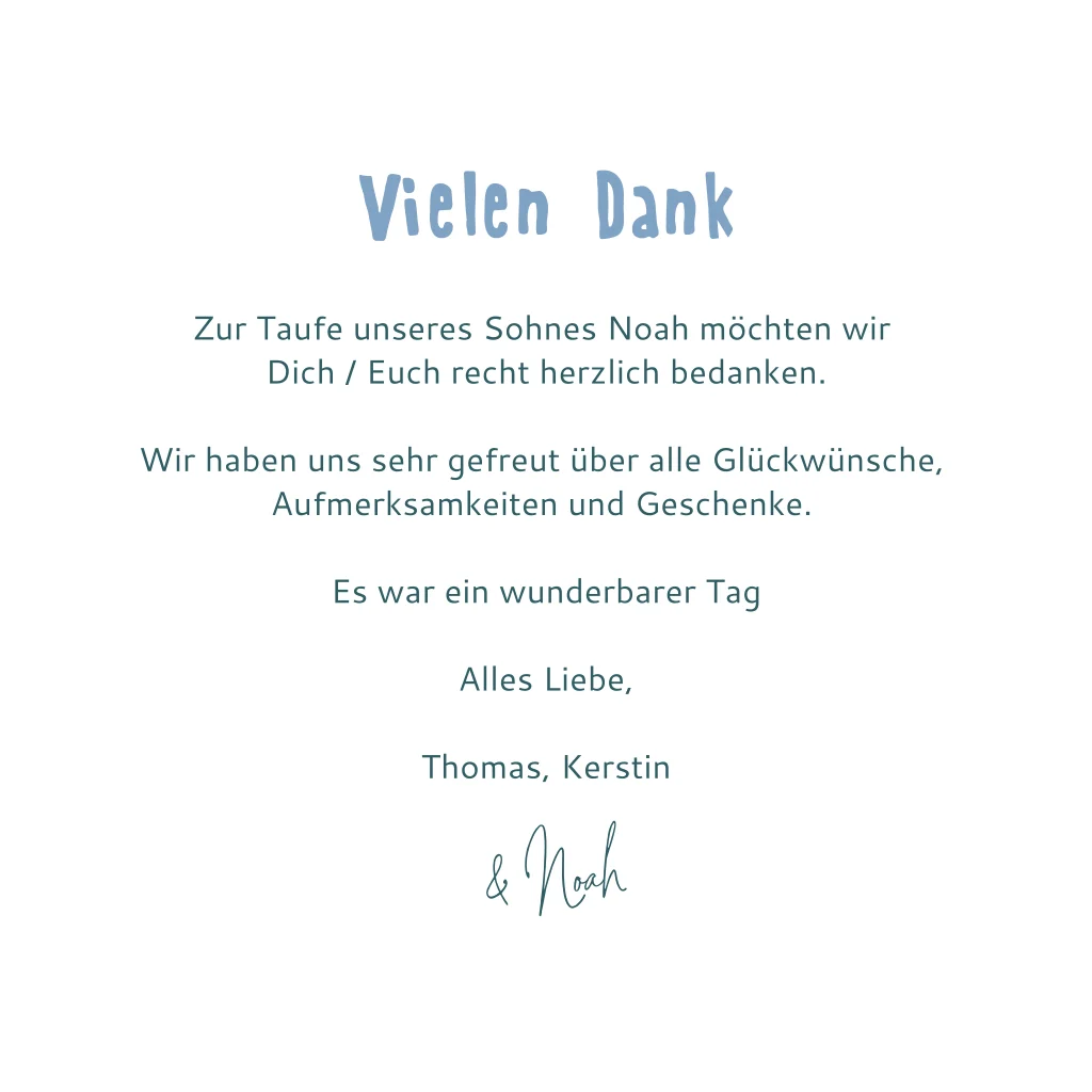 Quadratische Dankeskarte zur Taufe mit der Möglichkeit um mehrere Fotos hinzuzufügen. Auf der Vorderseite siehst du drei Fotos und Text in blauen Blöcken. Auf der Innenseite links kannst du ein großes Foto platzieren und auf der rechten Seite kannst du deinen Danksagungstext schreiben.Bei quadratische Karten fällt ggf. ein anderes Briefporto an. Alle Infos findest du auf der Website der Deutschen Post. Zu diesem Format erhältst du Umschläge in der Größe 14x12,5 cm. Format ändern ist möglich.