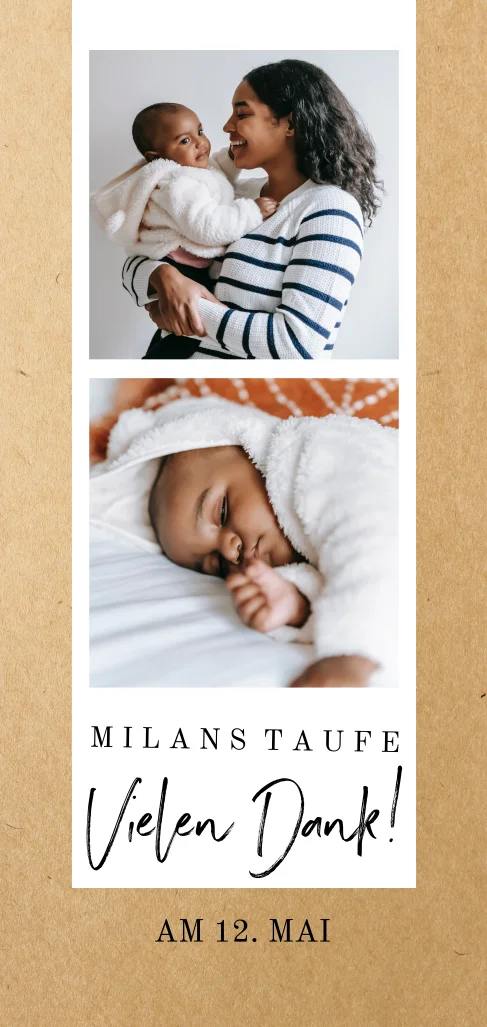 Diese elegante Einladung zur Taufe zeigt zwei Bilder des Täuflings im Polariod-Look.Melde dich für unseren Newsletter an und entdecke exklusive Angebote, kreative Inspirationen und spannende Neuigkeiten aus unserer Produktwelt. Als Dankeschön erhältst du 5 € Rabatt auf deine nächste Bestellung.