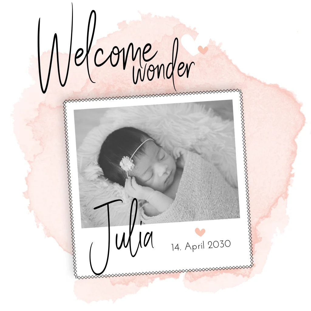 Geburtskarte mit Foto im Polaroidstil und rosa Aquarell-Look