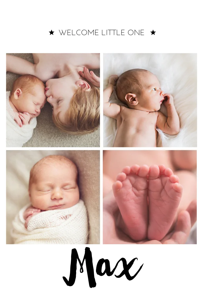 Weiße Geburtskarte mit eigenen Fotos und verspielter SchriftAuf der Suche nach mehr Inspiration? Sieh dir gerne auch unsere anderen Dankeskarten zur Geburt an.