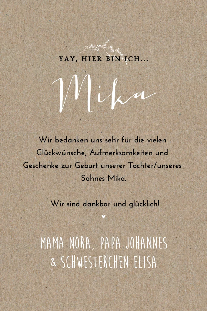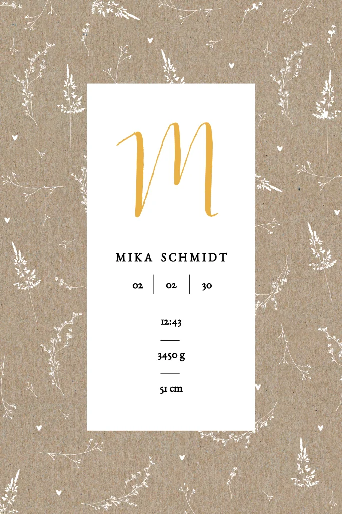 Minimalistische Doppelkarte zur Geburt deines Kindes. Mit hübschen schlichten Zweigen auf der Vorderseite. Auf der Innenseite kannst du links viele Fotos platzieren und rechts deinen Text und alle wichtigen Infos. Auf der Rückseite kannst du eure Adresse platzieren.Auf der Suche nach mehr Inspiration? Sieh dir gerne auch unsere anderen Dankeskarten zur Geburt an.
