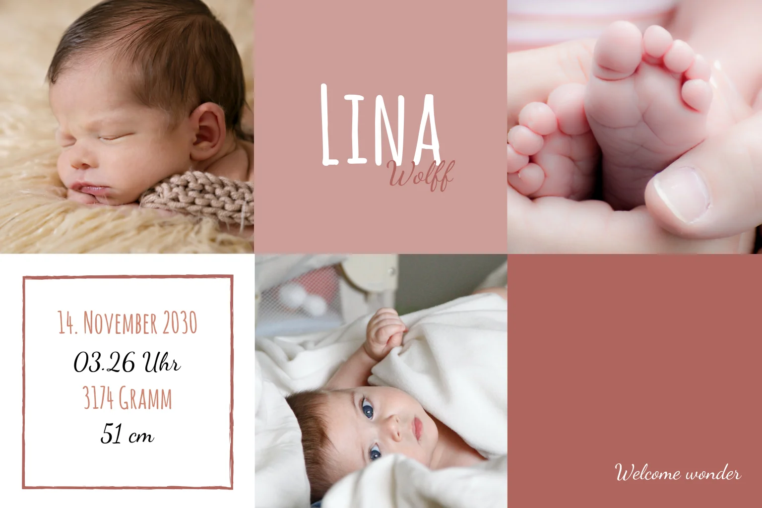 Diese schöne Geburtskarte, die ihr mit den Fotos eures Neugeborenen personalisieren könnt, besticht durch ihr modernes und ansprechendes Design.Auf der Suche nach mehr Inspiration? Sieh dir gerne auch unsere anderen Dankeskarten zur Geburt an.