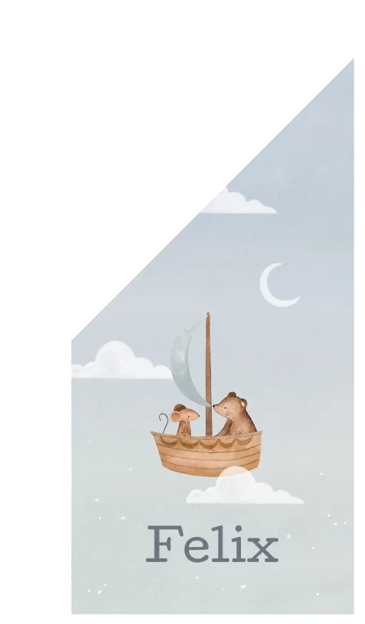 Geburtsfahne mit Bär und Maus im Boot Abmessung 60 x 60 x 120 cm. Die Fahne besteht aus einem robusten 610 g/m² PVC-Material und ist beidseitig bedruckt. Wir empfehlen, die Fahne bei starkem Wind abzunehmen, um Beschädigungen zu vermeiden.