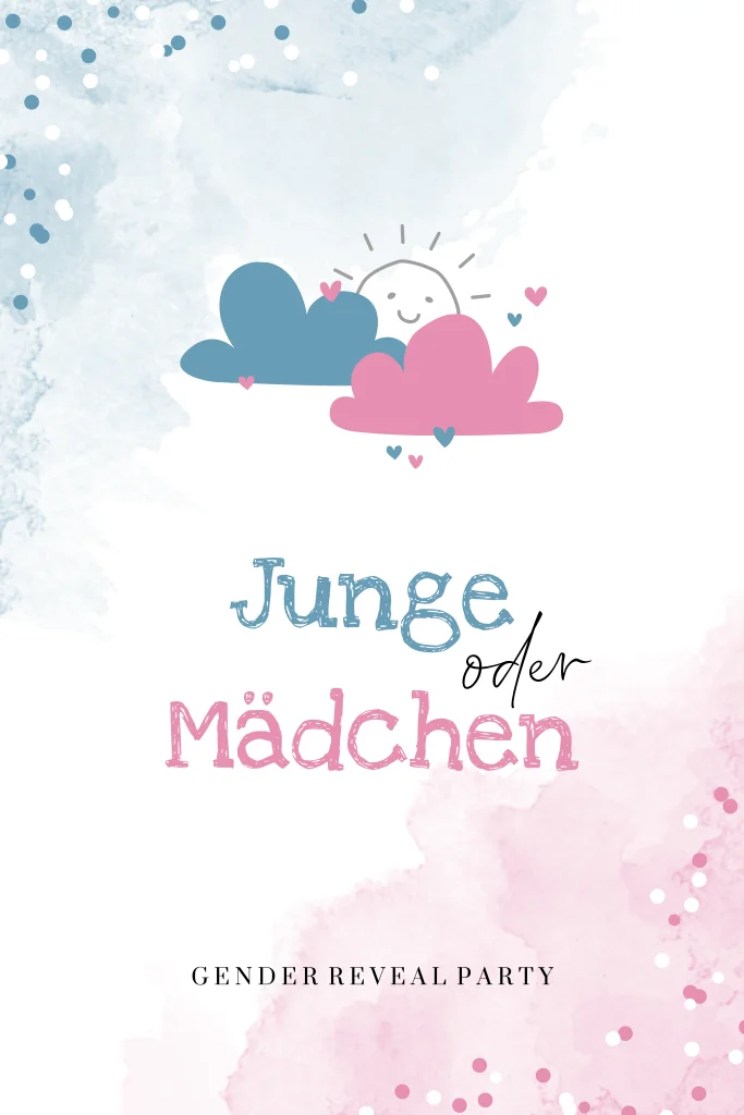Gender Reveal Einladungskarte mit rosa und hellblauen Wolken