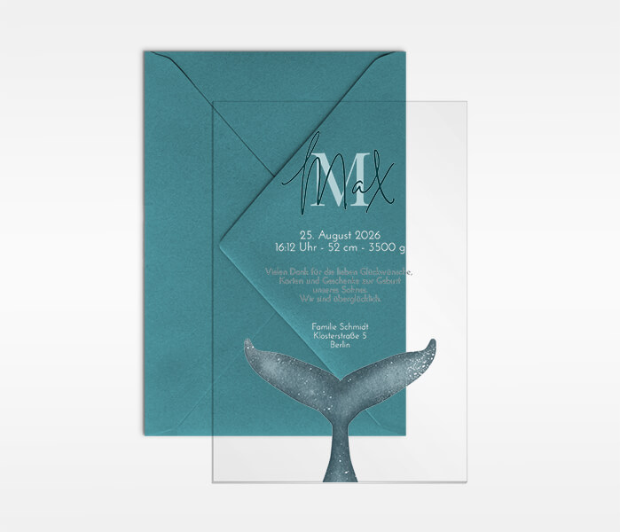 Stilvolle Acrylkarte zur Geburt mit Namen und Walflosse.