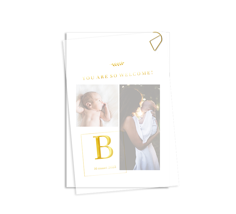Bestelle zu dieser Karte auch das passende Deckblatt. Dieses Deckblatt ist aus dünnem Transparentpapier hergestellt (150 g/m²). Vergewissere dich, dass dein Deckblatt die gleiche Größe hat wie deine Geburtskarte.