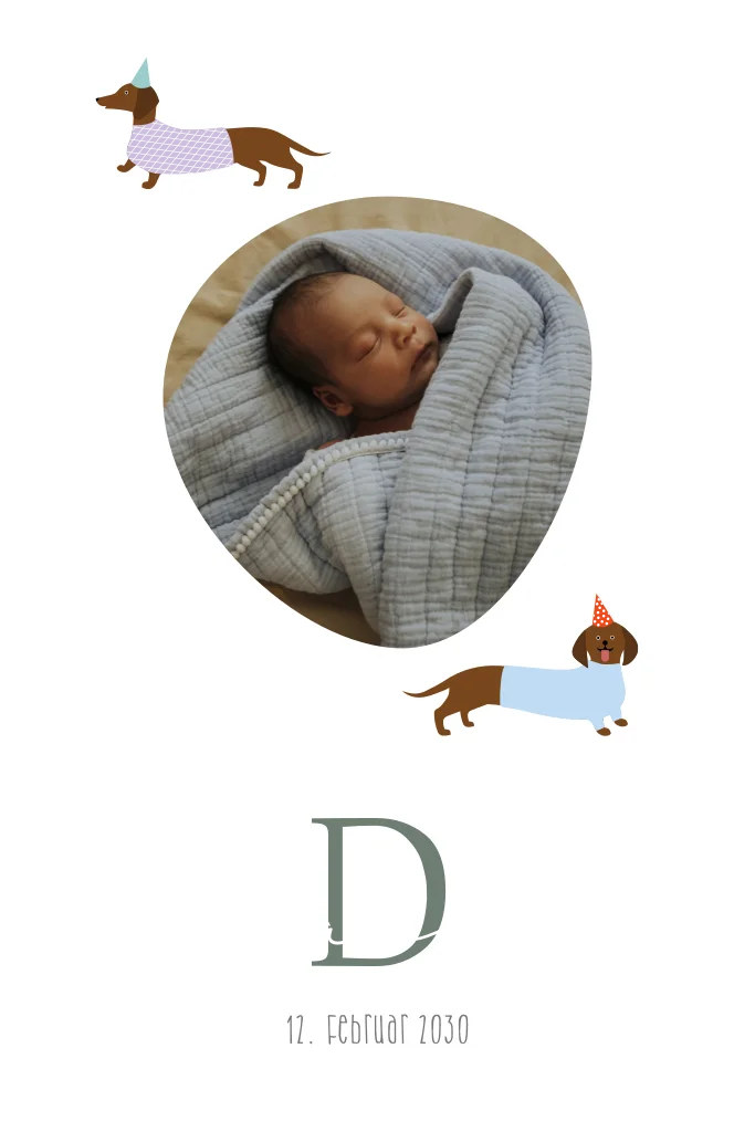 Hübsche Danksagungskarte zur Geburt mit Fotos und verspielten Dackeln.Auf der Suche nach mehr Inspiration? Sieh dir gerne auch unsere anderen Dankeskarten zur Geburt an.