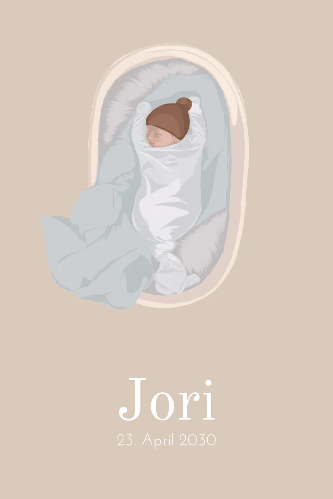 Die schlichte Geburtskarte im Hochformat ist eine elegante Art, die Geburt eines neuen Familienmitglieds zu verkünden. Die Vorderseite der Karte zeigt ein liebevoll illustriertes Baby und den Namen sowie das Geburtsdatum in glänzender Goldfolie auf einem beigen Hintergrund.Melde dich für unseren Newsletter an und profitiere von exklusiven Angeboten, kreativen Ideen und Neuigkeiten aus unserer Produktwelt. Als Dankeschön für deine Anmeldung schenken wir dir einen kostenlosen Probedruck deiner Karte.