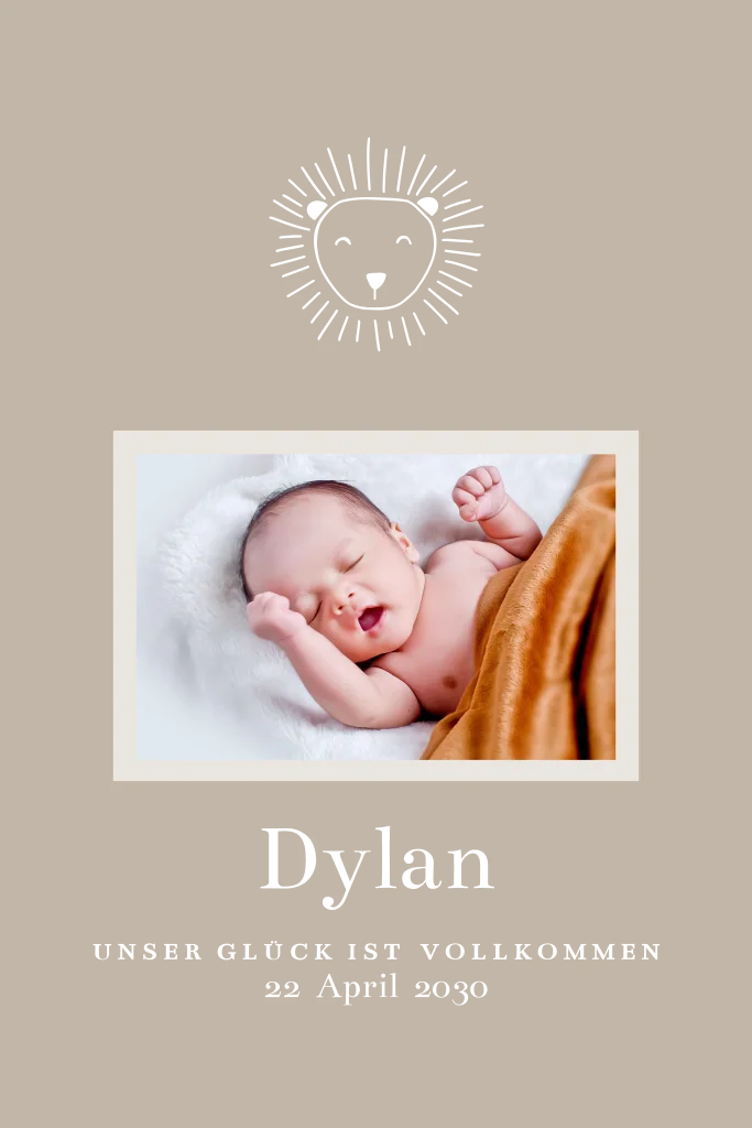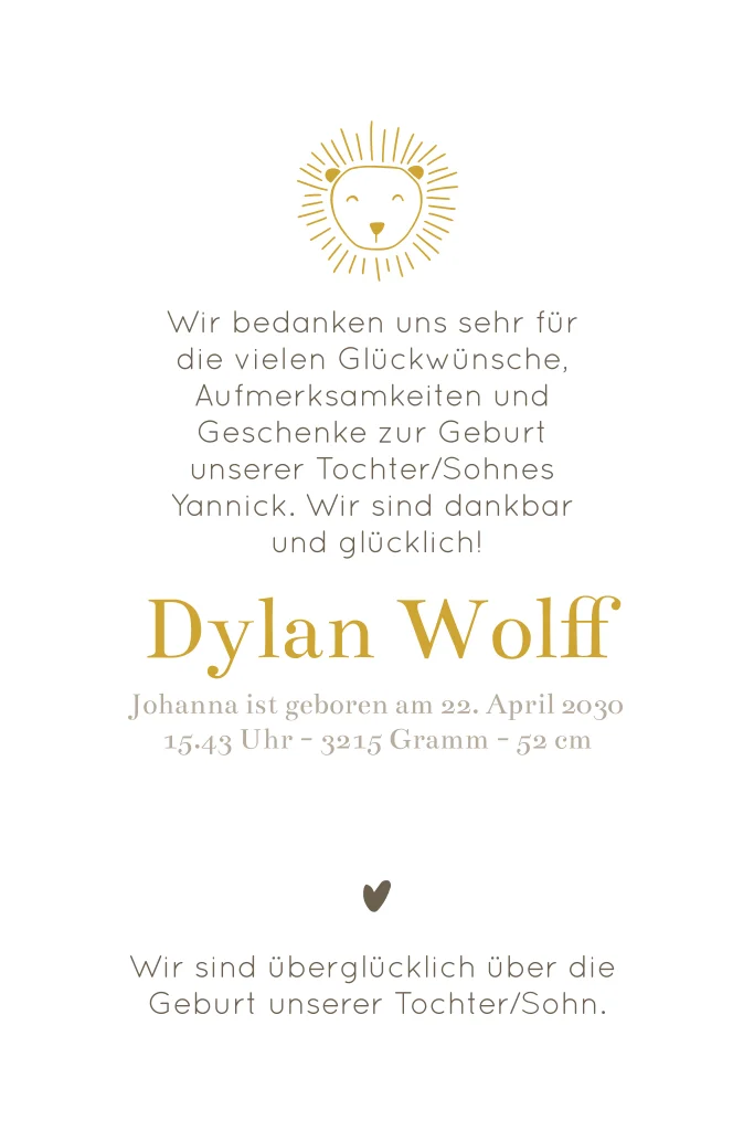 Süße Vintage Babykarte zur Geburt deiner Tochter/deines Sohnes mit gezeichnetem Löwenmotiv, Herzchen und stilvollem Schriftzug auf einer Doppelkarte. Du hast die Möglichkeit selbst kreativ zu sein, indem dus die Karte nach eigenen Wünschen gestaltest.Auf der Suche nach mehr Inspiration? Sieh dir gerne auch unsere anderen Dankeskarten zur Geburt an.