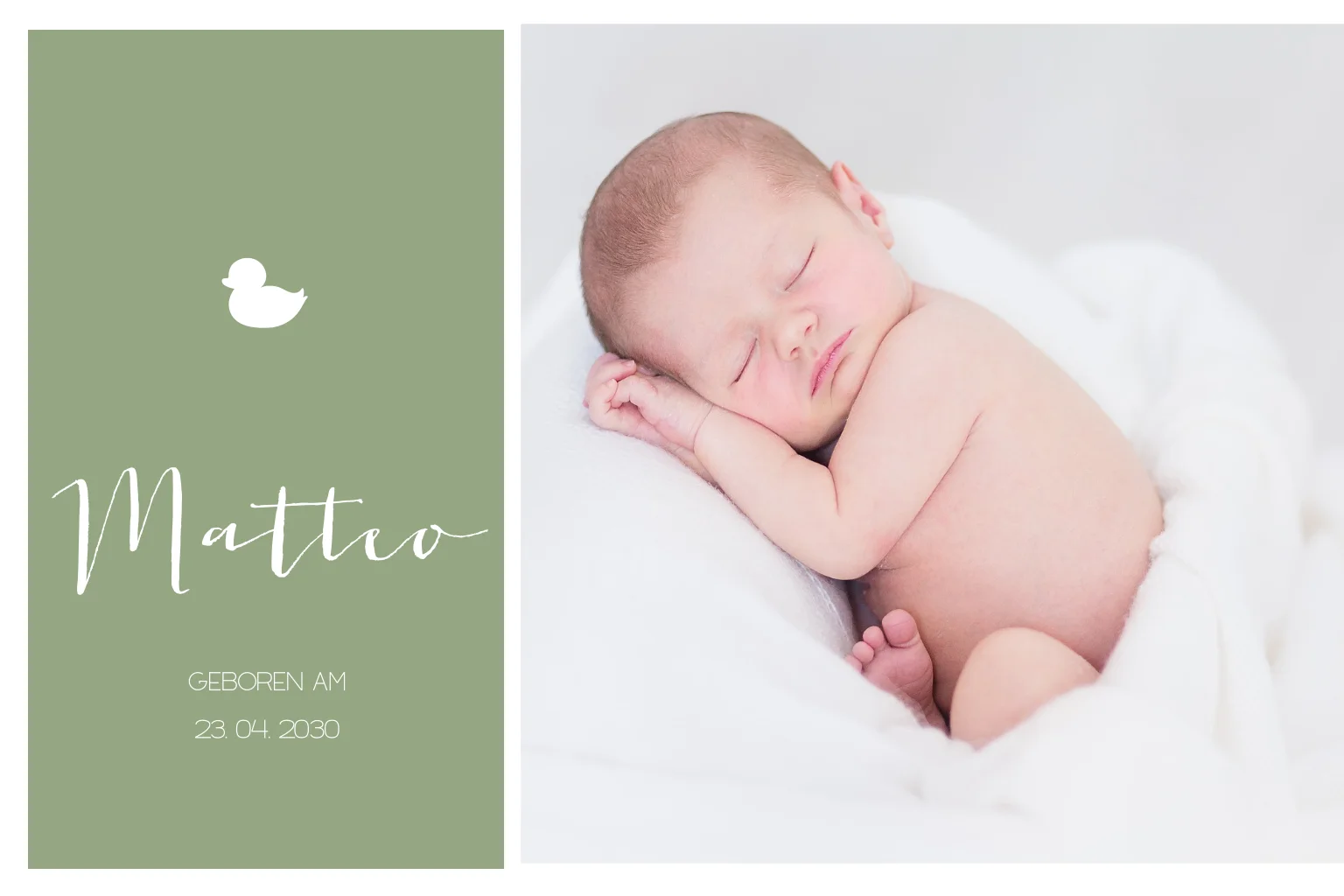 Geburtskarte mit quadratischem Babyfoto und grünen Farbflächen