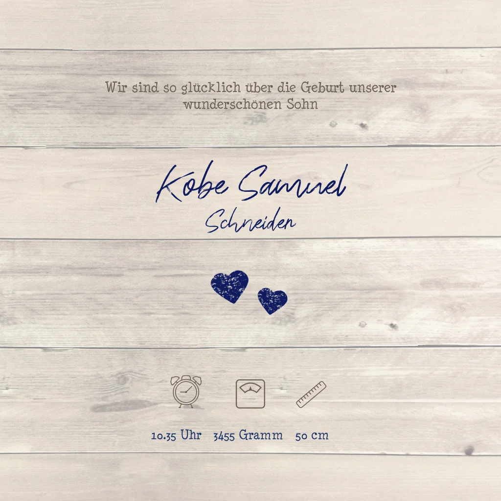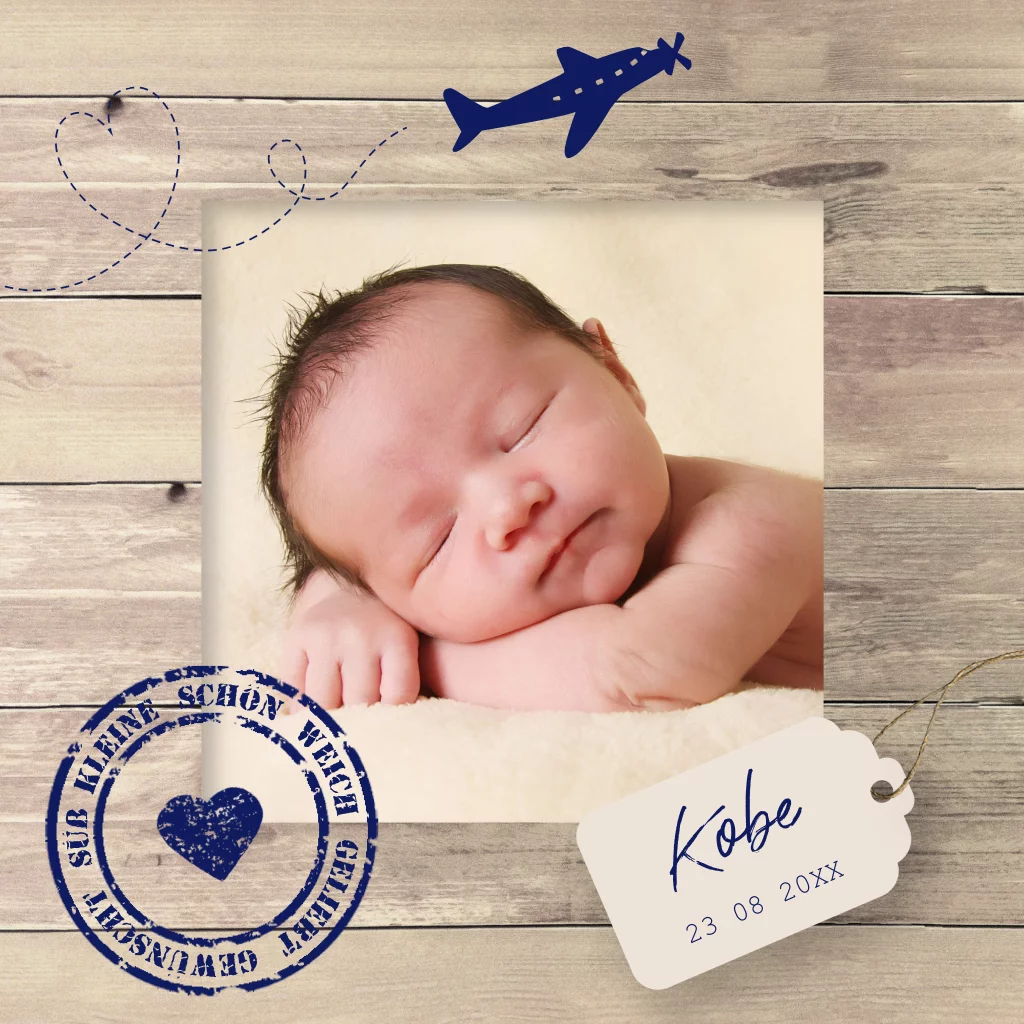 Die Geburt des eigenen Kindes ist einer der schönsten Momente im Leben vieler Menschen. Um diesen Anlass gebührend zu feiern und diese wunderschöne Botschaft zu verkünden, eignen sich personalisierte Geburtskarten perfekt, denn mit einer liebevoll gestalteten Karte drückt ihr nicht nur die Zuneigung zu eurem Baby aus, sondern auch die Wertschätzung gegenüber dem Empfänger. Diese trendige Foto-Geburtsanzeige hat einen Hintergrund in Holzoptik, "Briefmarken", ein Vintage-Etikett und ein Flugzeug. Platziere das süßeste Foto des Babys auf dieser coolen Babykarte.