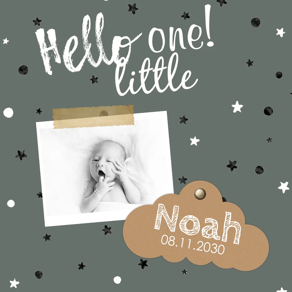 Hipp und cool: das ist diese Geburtskarte! Der dunkelgrüne Hintergrund ist mit trendigen Punkten und Sternen verziert. Das Besondere ist die Wolke, in die ihr den Namen und das Geburtsdatum und daneben ein eigenes Foto eures Babys platzieren könnt!
