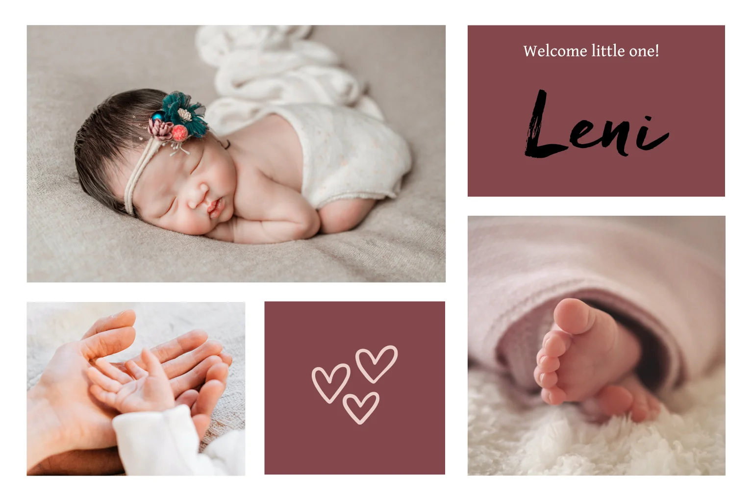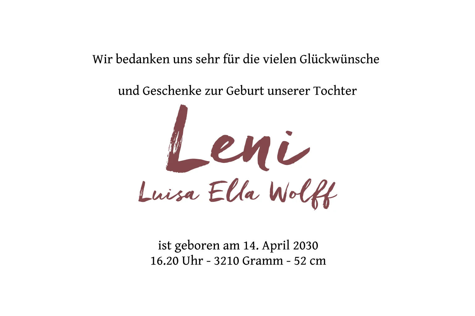 Die Geburt des eigenen Kindes ist einer der schönsten Momente im Leben vieler Menschen. Um diesen Anlass gebührend zu feiern und diese wunderschöne Botschaft zu verkünden, eignen sich personalisierte Geburtskarten perfekt, denn mit einer liebevoll gestalteten Karte drückt ihr nicht nur die Zuneigung zu eurem Baby aus, sondern auch die Wertschätzung gegenüber dem Empfänger. Beachte: Durch den Zuschnitt der Karten können 1-3mm Breitenunterschied (links/rechts und oben/unten) am Rahmen auftreten. Tipp: Gestalte den Rand so groß wie möglich, damit dieser mögliche Unterschied nicht auffällt.Auf der Suche nach mehr Inspiration? Sieh dir gerne auch unsere anderen Dankeskarten zur Geburt an.